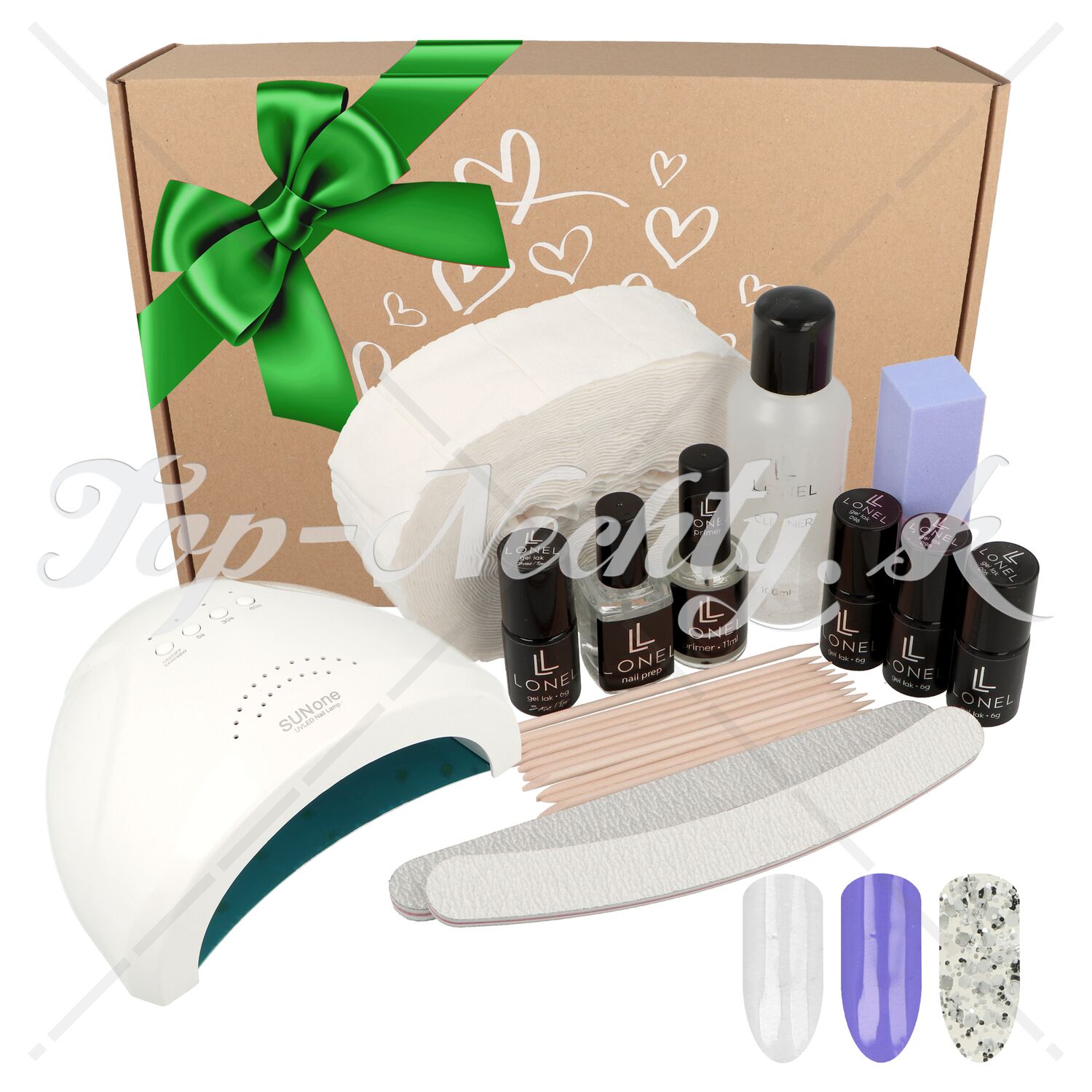 26-dielna sada v darčekovom balení. Nájdete v nej prípravky a pomôcky na tvorbu gél lak nechtov a takisto 5 gél lakov v neónových farbách.