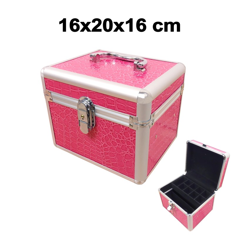Ľahko prenosný kozmetický kufrík ružovej farby. Má moderný dizajn a jeho povrch pripomína kožu. Vhodný na uskladnenie drobností ako sú šperky, korálky, gél lak, make-up a podobne. Súčasťou kufríka sú aj kľúče na jeho uzamknutie. Vnútro je vystlané čiernym zamatom. Kufrík má poličku s malými priehradkami, ktorá sa dá vybrať. Je umiestená na kovových koľajničkách, po ktorých sa dá polička posúvať. Vnútri je vrecko a úchyty na stabilné uloženie materiálu. Túto spodnú časť je možné rozdeliť pomocou pohyblivej časti. Rozmer celého kufríka je 16 x 20 x 16 cm.