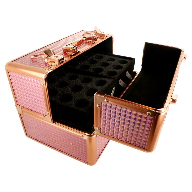 Pevný kufrík na kozmetiku, nechtové pomôcky alebo na materiál na kreatívne tvorenie. Jeho vnútro je vystlané zamatom. Má vyberateľné poličky, do ktorých môžete bezpečne uložiť laky alebo iné malé fľaštičky. Ak nepotrebujete skladovať alebo prenášať takto balené veci, môžete molitanové časti vybrať. Kufrík môžete zamknúť priloženým kľúčom. Rozmery kufríka sú 30 x 20 x 20cm. Nosnosť 4kg.
